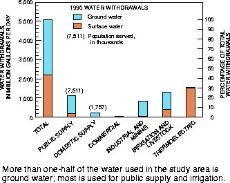 More than one-half of the water used in the study area is ground water; most is used for public supply and irrigation. |