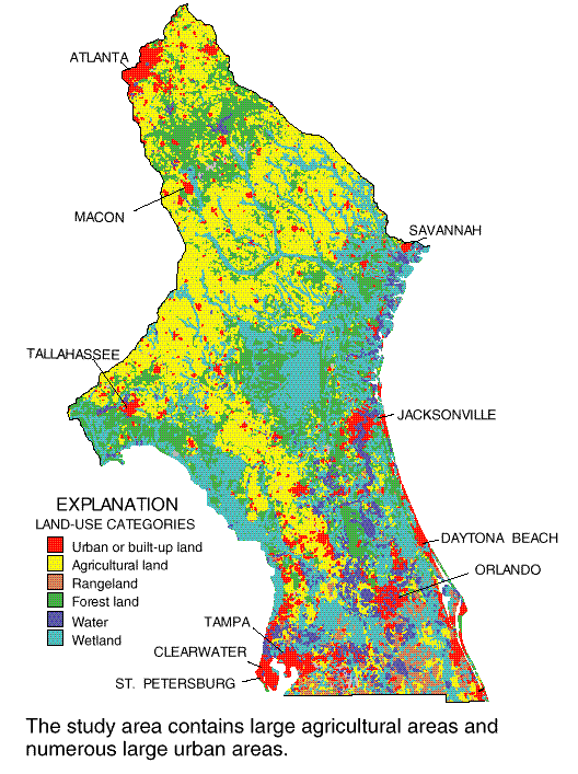 More than one-half of the study area is forest land used for the production of paper products and lumber (Berndt and others, 1996). Agricultural land covers about 25 percent of the study area. Field crops (including cotton, peanuts, corn, soybeans, and wheat) are grown in the central part of the study area, vegetables are grown throughout, and citrus crops are grown in the southern part of the study area. Dairy and poultry farms are present in northern and central parts of the study area. |
