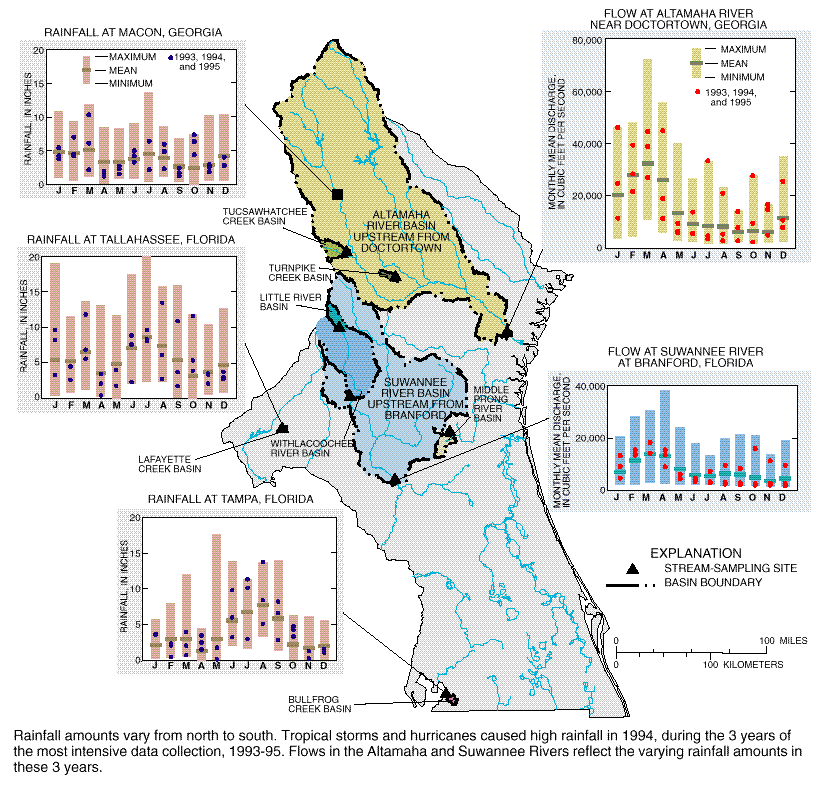 Rainfall amounts vary from north to south. Tropical storms and hurricanes caused high rainfall in 1994, during the 3 years of the most intensive data collection, 1993-95. Flows in the Altamaha and Suwannee Rivers reflect the varying rainfall amounts in these 3 years.