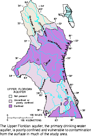 The Upper Floridian aquifer, the primary drinking-water aquifer, is poorly confined and vulnerable to contamination from the surface in much of the study area. |