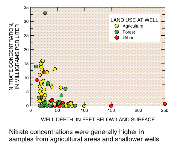 Nitrate concentrations commonly are highest in shallow wells due to sources of nitrogen at the land surface. Nitrate concentrations were higher in water from shallow wells in agricultural areas, but even samples from the most shallow wells in the urban areas had fairly low nitrate concentrations. The highest nitrate concentration (33 mg/L) was in a sample from a well located in a forest area with confined animal feedlots located nearby.