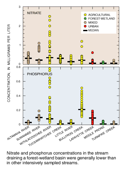 Among the synoptic basins, the median dissolved phosphorus concentration was 0.08 mg/L for urban streams and 0.06 mg/L for agricultural streams. The highest median phosphorus concentration among the intensively sampled streams was in Bullfrog Creek, which drains an agricultural basin along the coast of west-central Florida. The high phosphorus concentrations at Bullfrog Creek may be partly derived from phosphate deposits in the area. The lowest median phosphorus concentrations were in Middle Prong (forest-wetland basin), in Tucsawhatchee Creek (agricultural basins), and in Turnpike Creek (mixed basin).