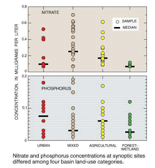 Nitrate and phosphorus concentrations at synoptic sites differed among four basin land-use categories. |