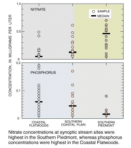 Nitrate concentrations at synoptic stream sites were highest in the Southern Piedmont, whereas phosphorus concentrations were highest in the Coastal Flatwoods. |
