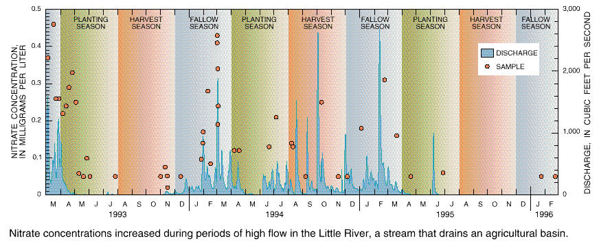 Nitrate concentrations increased during periods of high flow in the Little River, a stream that drains an agricultural basin.