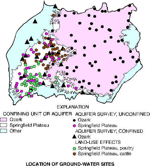 Springs and wells in the Springfield Plateau aquifer and unconfined part of the Ozark aquifer were randomly selected for sampling as part of the unconfined aquifer survey. Several public-supply wells in the confined part of the Ozark aquifer also were selected for sampling. To aid study of the effects of land use and hydrogeology on ground-water chemistry, springs and wells were randomly selected in a poultry-production area and a cattle-production area of the Springfield Plateau. Land-use and hydrogeologic information was used to characterize springs and wells after they were selected and sampled.