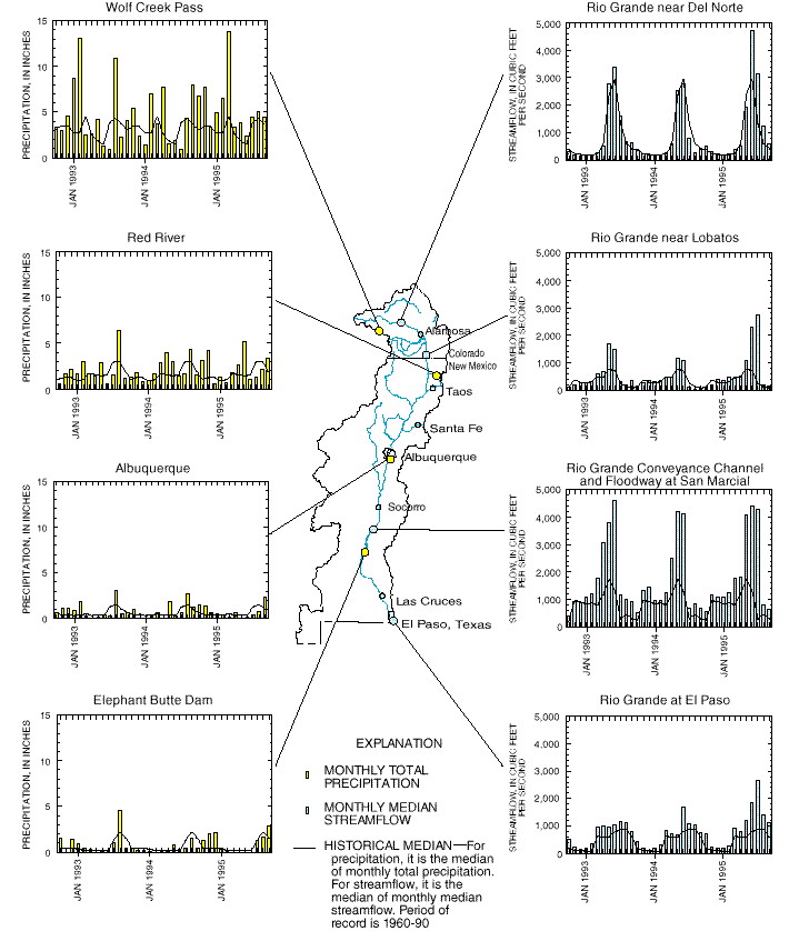A comparison of precipitation and streamflow at selected sites for the study period 1992-95 with the historical period 1960-90 is shown above. Monthly total precipitation during the study period was generally higher than the monthly median at the two northern sites, whereas precipitation at the two southern sites was near the median. The monthly median streamflow at the two northern sites was generally about the same as the historical median monthly streamflow except during spring runoff when the monthly median during the study period exceeded the historical median streamflow. The streamflow at the two southern sites is controlled primarily by reservoir releases, but did exceed the historical median during the irrigation season. The impact of the above average precipitation and streamflow on the water quality of the Study Unit cannot be generalized, it must be evaluated on a site by site basis. This detailed evaluation is necessary because of the complexity of the interaction of surface water and ground water, irrigation withdrawal and return, and reservoir storage and release.