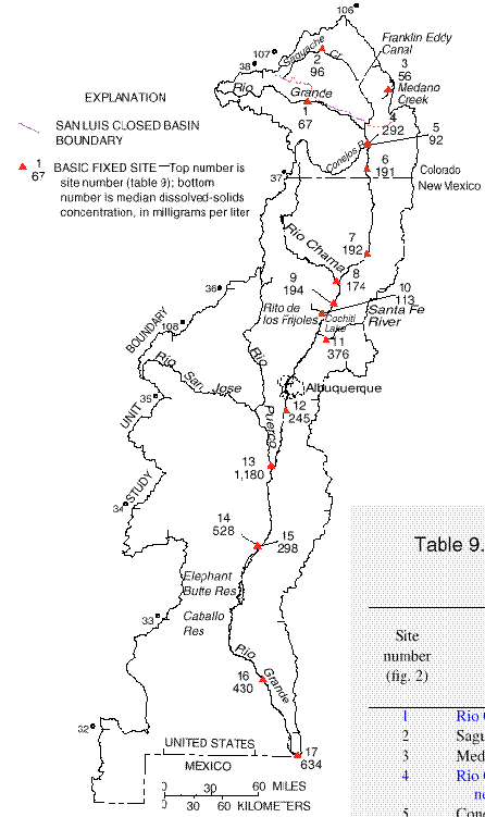 The largest median dissolved-solids concentration for the Basic Fixed Sites was at site 13 on the Rio Puerco. The Rio Puerco, a typical tributary to the Rio Grande in the southern part of the basin, was the only ephemeral stream sampled in this area. It illustrates the importance that ephemeral streams in semiarid environments have on dissolved-solids concentrations, particularly in load calculations. In one or two storm-runoff events from these tributaries, most of the calculated dissolved-solids load for the year can occur.