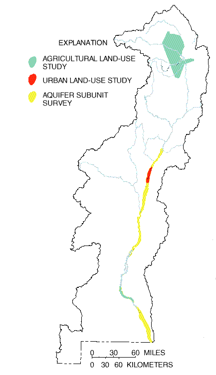 Examine natural and human factors that affect the quality of shallow ground water that underlies areas of urban land, overhead, center-pivot sprinkler-irrigated agriculture land, or flood-irrigated agricultural land.