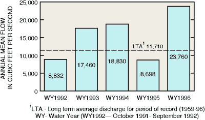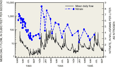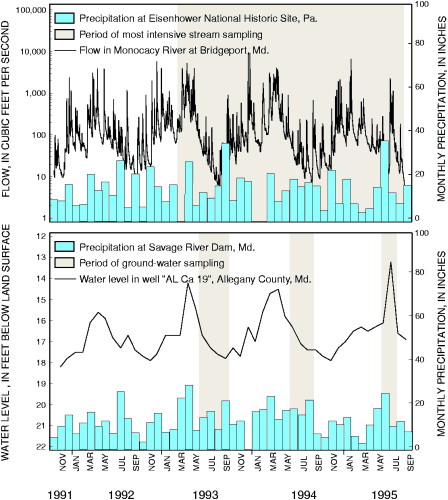 Hydrologic conditions affect the quality of streams and ground water in the Potomac River Basin. Fertilizers, pesticides, and other chemicals that are applied to the land surface may infiltrate to ground water or run off to streams during rainfall depending on the season, soil properties, and the intensity and duration of precipitation. During dry periods, flow in most streams of the Potomac River Basin is sustained by discharge from ground water (fig. 7) and streamwater quality is similar to that of ground water. When flows are elevated during storms, streams of the basin typically become concentrated in chemicals that are washed from the land (fig. 8), although streams in some areas may become diluted.