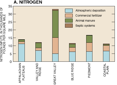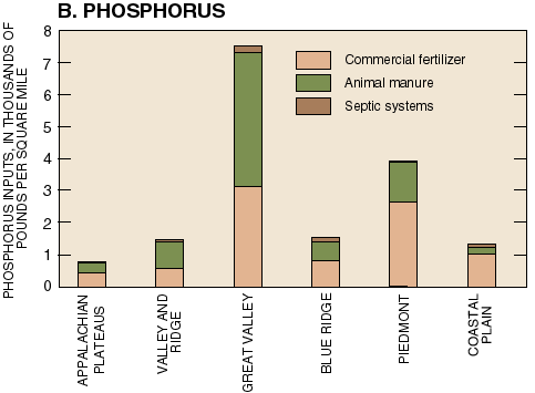 Nutrient inputs to the Potomac River Basin are related to land use. The Great Valley (fig.3), which is 45 percent cropland, received the largest estimated inputs from non-point sources of both nitrogen and phosphorus per unit area in 1990, followed by the Piedmont (including the Triassic Lowlands), which is 43 percent agricultural and 25 percent urban (Vogelmann and others, 1997; Hitt, 1994). Inputs to these areas were mostly attributed to commercial fertilizers and manure. Dominantly forested areas of the basin received smaller inputs of nitrogen (mostly from atmospheric deposition) and phosphorus per unit area in 1990. (fig. 10).