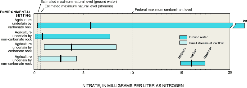 Elevated nitrogen concentrations in streams and ground water are common in the Potomac River Basin in areas of intensive row cropping and carbonate bedrock. Nitrate is the most common form of nitrogen in waters of the basin. Nitrate concentrations may vary considerably during the year at any given location because of seasonal variations in precipitation and inputs, but they generally exceed natural concentrations more often in streams and ground water in agricultural areas of the basin than in areas with other land uses. This is particularly evident in areas underlain by carbonate bedrock, where natural waters are more susceptible to such contamination (figs. 11, 12). Elevated nitrate concentrations in streams and ground water in some urban areas indicate that urban sources also contribute nutrients to the basin, although relatively few samples were collected in these areas during this study (Ator and Denis, 1997; Miller and others, 1997). Because nitrogen sources are typically surficial, concentrations are often greater in shallower than in deeper ground water (Blomquist and others, 1996). This is not evident from the data, however, likely because mostly shallow wells were sampled.