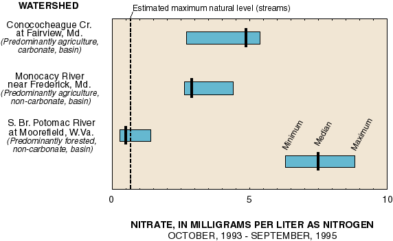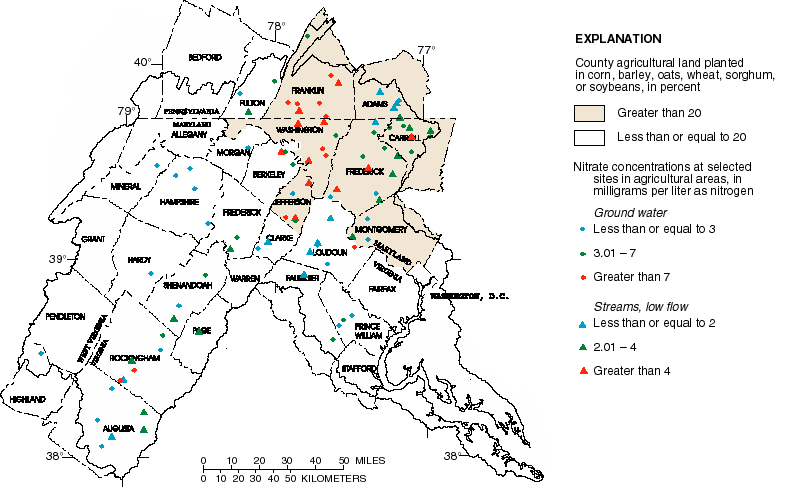 Nitrate concentrations that exceed natural concentrations are more common in streams and ground water in agricultural areas in the northeastern part of the Potomac River Basin than in other agricultural areas that contain lesser percentages of row cropping (fig. 13) (Ator and Denis, 1997; Miller and others, 1997). In 1992, row crops accounted for less than 20 percent of agricultural land in most counties of the basin, but as much as 47 percent of such land in counties in the northeastern part (U.S. Department of Commerce, 1995). Nitrogen is typically applied in greater quantities to crops in the form of fertilizer and manure than to pastures in the form of manure.