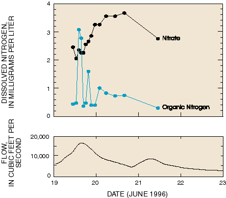 Figure 14. Organic nitrogen concentrations were elevated for a short time during high flow in Conococheague Creek in June 1996 but quickly decreased as the flow subsided. Concentrations of nitrate, a much more soluble form of nitrogen, were slightly depressed during the high flow.