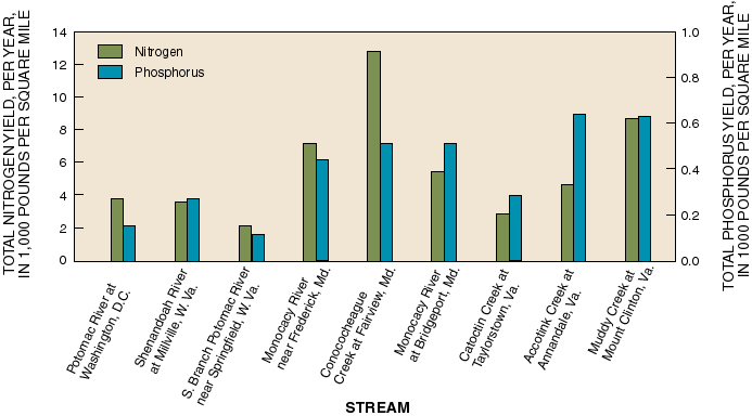 Streams draining primarily agricultural or urban areas yield the greatest quantities of nutrients to the Potomac River. Although the Shenandoah River contributes the greatest loads of total nitrogen and phosphorus among streams at which data were collected over time, Conococheague Creek, Muddy Creek, and the Monocacy River, which drain primarily agricultural watersheds, yield the largest loads of total nitrogen per square mile. Accotink Creek, an urban stream, yields the largest loads of total phosphorus per square mile, followed by Muddy and Conococheague Creeks and the Monocacy River (fig. 15).
