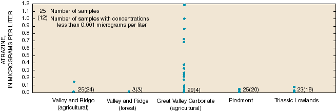 Pesticides were commonly detected in streams and ground water in agricultural areas of the Potomac River Basin; samples from forested areas rarely contained detectable pesticides. Much of the agriculture in the basin is in the Great Valley, Piedmont, and Triassic Lowlands (fig. 3). In carbonate areas of the Great Valley, atrazine (figs. 16, 17), deethylatrazine, simazine, prometon, and metolachlor were each detected in more than half of the samples from ground water and small streams. Pesticides were also commonly detected in ground water and streams of the Piedmont and Triassic Lowlands. In the mostly forested Valley and Ridge, however, detections of pesticide compounds in streams were much less frequent, and there were virtually no detections in ground water. Six compounds (atrazine, deethylatrazine, p,p'-DDE, metribuzin, prometon, and simazine) were each detected in a single ground-water sample from the Valley and Ridge, and dichlorbenil was detected in four samples. Only atrazine, deethylatrazine, metolachlor, prometon, simazine, and tebuthiuron were detected in small-stream samples from the Valley and Ridge.