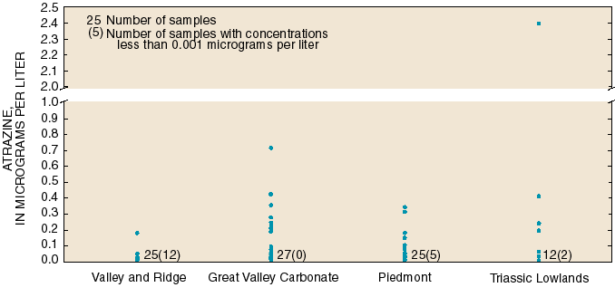 Figure 16. Concentrations of atrazine in ground water in sampled areas of the Potomac River Basin. Atrazine was most commonly detected in ground water in agricultural areas of the Great Valley.