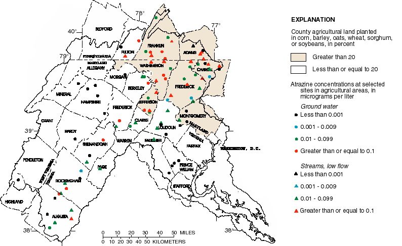 Pesticide concentrations in streams and ground water of the Potomac River Basin are greatest in areas of intense crop production - particularly in the corn-producing northeastern counties and in the Great Valley. Pesticide concentrations in ground water and small streams were typically higher in samples from the more heavily cropped areas than other agricultural areas (fig. 18). Among larger streams, the highest incidence of detections and elevated concentrations of atrazine and metolachlor also occurred predominantly in these areas, particularly in the Monocacy River and Opequon, Conococheague, and Antietam Creeks.