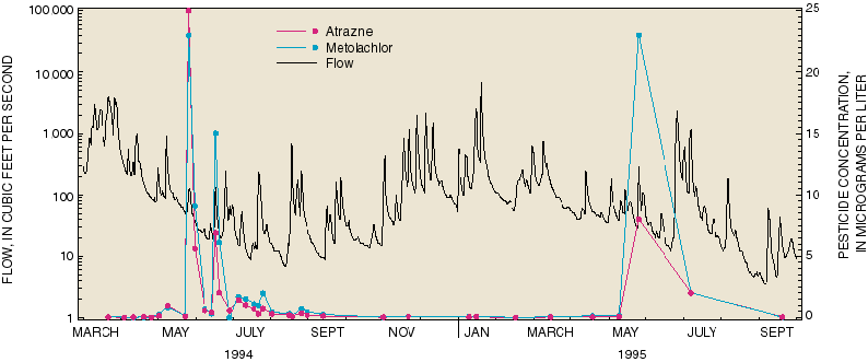 Maximum concentrations of most pesticides occur in streams during the spring and early summer months, although atrazine and metolachlor are present year round in agricultural areas. The Monocacy River at Bridgeport, Md., for example, drains 173 square miles, almost 80 percent of which is agricultural. Pesticide concentrations in this stream are related to flow, but the major controlling factor is the seasonal application (fig. 19). During a storm in May 1994, concentrations of alachlor (3.1 µg/L), atrazine (25 µg/L), cyanazine (3.0 µg/L), and metolachlor (23 µg/L) in the Monocacy River were the highest measured in any water sample during this study. Other pesticides frequently detected in the Monocacy River included simazine, prometon, and linuron. Of the 45 pesticides for which samples from this site were analyzed, 19 were detected at least once during the period of most intensive sampling in 1994. Pesticide concentrations in the Potomac River also were highest in the spring, during the time of applications. Concentrations declined through the summer months and were nearly undetectable in late fall and winter.