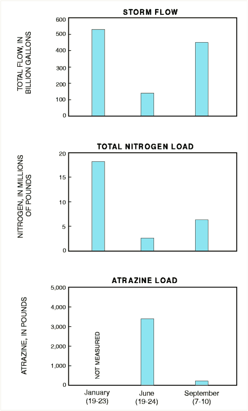 The Potomac River at Washington, D.C., carried 25 times as much atrazine during the June flood as in September, even though the flow was three times greater in September. Over a 5-day period, the river carried an estimated 3,300 pounds of atrazine and 3.3 million pounds of nitrogen. On two consecutive days following the June storm, atrazine was measured in the river at concentrations greater than the MCL of 3 µg/L. Pesticides and fertilizers are generally applied to the land in the spring, whereas nitrogen may be applied in the form of manure throughout the year.
