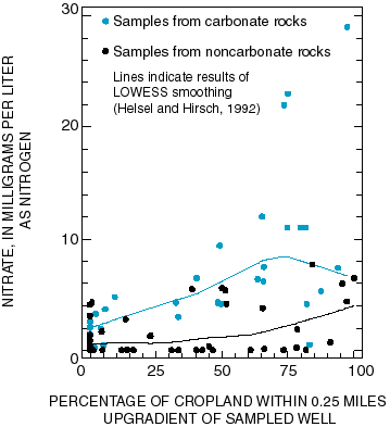 Figure 21. Nitrate concentrations in ground-water samples from the Potomac River Basin increase with increasing percentages of cropland, but are typically higher in samples from carbonate rocks like those of the Great Valley than in samples from rocks of other types.