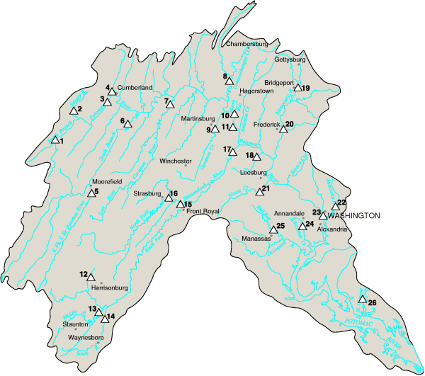 Figure 24. Mercury contamination from an industrial source in Waynesboro, Va. (possibly lasting over a period of decades), has led to widespread contamination of the South Fork Shenandoah and Shenandoah Rivers (to about 171 river miles downstream). It is possible that contamination from this source has spread as far downstream as the Potomac River at Washington, D.C.