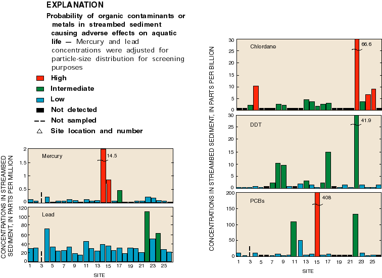 Chlorinated organic compounds and trace metals are present in streambed sediment of the Potomac River and its tributaries at concentrations that have some potential to adversely affect aquatic life. Sediment from 14 of 25 sites contained chlordane, DDT, PCBs, lead, or mercury at concentrations that pose an intermediate probability of causing adverse effects on aquatic life; concentrations at six sites indicate a high probability of causing adverse effects on aquatic life.