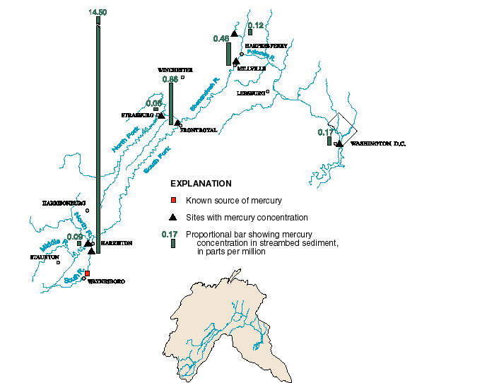 Mercury was detected in all streambed sediment samples from the Potomac River Basin and poses a potential threat to aquatic life at six sites (Gerhart and Blomquist, 1995). Although it occurs naturally in trace amounts in the Earth's crust, mercury may be introduced as a contaminant to the environment as a consequence of human activities. Mercury is used in the manufacture of paints, paper, and vinyl chloride, and it can also be found in batteries and fungicides.