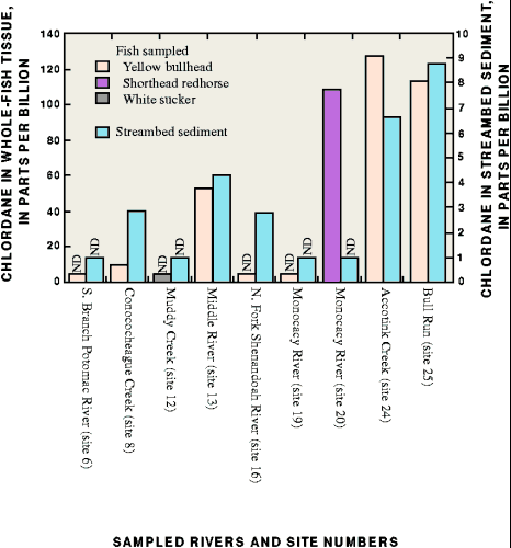 Chlordane concentrations in fish tissue pose a threat to fish-eating wildlife at two sites in the Potomac River Basin. Whole-fish tissues from two streams in Virginia, Bull Run (site 25) and Accotink Creek (site 24), contained chlordane at concentrations exceeding the National Academy of Sciences, National Academy of Engineering (NAS/NAE) (1973) recommended maximum concentration for the protection of fish-eating wildlife. These sites are in the heavily urbanized Washington, D.C., area. A human health advisory including chlordane currently exists for the consumption of fish caught in Washington, D.C., waters, "due to PCBs and other compounds" (Hamid Karimi, District of Columbia Department of Consumer and Regulatory Affairs, written commun., 1994). Possible effects of chlordane on human health include cancer, dizziness, headache, fatigue, and convulsions. No Asiatic clam samples contained chlordane at concentrations threatening to humans or wildlife.