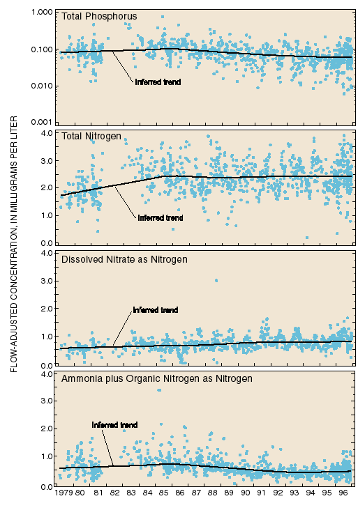 Figure 28. Flow-adjusted nutrient concentrations in the Potomac River at Washington, D.C., 1979-96. Total phosphorus concentrations have decreased over this period. Recent trends in nitrogen concentrations are more complicated; ammonia plus organic nitrogen concentrations have decreased, whereas nitrate concentrations have increased, resulting in apparently stable total nitrogen concentrations since about 1985 (modified from Darrell and others, in press).