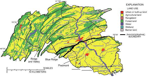 In the Lower Susquehanna River Basin Study Unit, land use is 47 percent agricultural, 47 percent forested, and 4 percent urban; 2 percent of the area is water bodies or barren land (Mitchell and others, 1977; see map above). The well-drained areas with rolling hills and valleys in the southern part of the basin contain most of the population and some of the most productive agricultural land in the Nation. These agricultural and urban areas commonly are areas underlain by carbonate (limestone) bedrock.