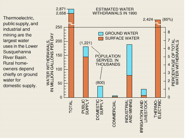 Thermoelectric, public supply, and industrial and mining are the largest water uses in the Lower Susquehanna River Basin. Rural homeowners depend chiefly on ground water for domestic supply.
