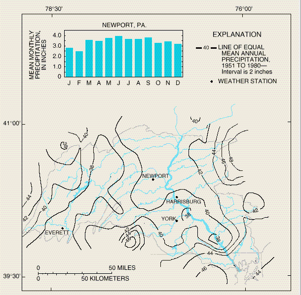 Mean annual precipitation in the Lower Susquehanna River Basin Study Unit ranges from 38 to 48 inches (see figure). The precipitation is generally less in the center of the basin because of storm patterns; however, the entire Study Unit receives enough rainfall so that irrigation is not common except in periods of drought. The precipitation is distributed fairly evenly throughout the year. About 45 percent of the precipitation is contributed by storms in May through September during the growing season, and much of this precipitation is used by plants. Most of the remaining 55 percent occurs when vegetation is dormant; therefore, this precipitation is more available to infiltrate into bedrock and enter ground-water systems.