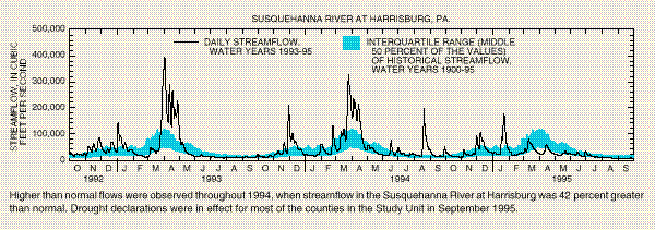 Higher than normal flows were observed throughout 1994, when streamflow in the Susquehanna River at Harrisburg was 42 percent greater than normal. Drought declarations were in effect for most of the counties in the Study Unit in September 1995.