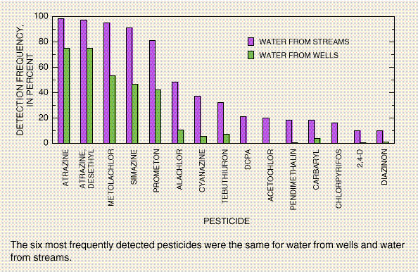 The six most frequently detected pesticides were the same for water from wells and water from streams.