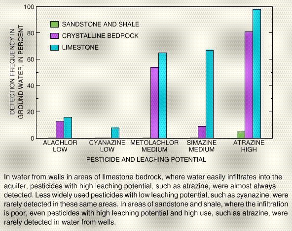 In water from wells in areas of limestone bedrock, where water easily infiltrates into the aquifer, pesticides with high leaching potential, such as atrazine, were almost always detected. Less widely used pesticides with low leaching potential, such as cyanazine, were rarely detected in these same areas. In areas of sandstone and shale, where the infiltration is poor, even pesticides with high leaching potential and high use, such as atrazine, were rarely detected in water from wells.