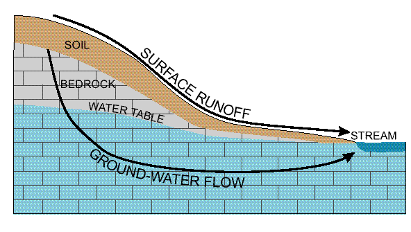 The amount of water that runs off the land surface or infiltrates into the ground depends on factors such as slope and how easily water can flow through the soil and bedrock material. In areas of limestone bedrock, where water can readily infiltrate into the ground, pesticides were commonly detected in ground water. The same pesticides detected in ground water were usually detected in streams during times when the flow in the streams is sustained by flow from ground water. In areas of sandstone and shale, where water does not easily flow through the soil and bedrock material, the easiest pathway for the water is to run off over the land. Pesticides were rarely detected in ground water in these areas.
