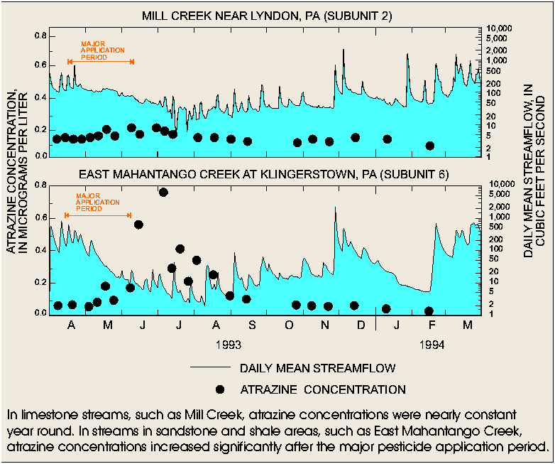 In limestone streams, such as Mill Creek, atrazine concentrations were nearly constant year round. In streams in sandstone and shale areas, such as East Mahantango Creek, atrazine concentrations increased significantly after the major pesticide application period.