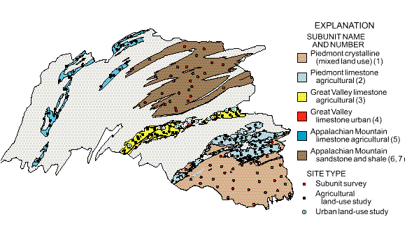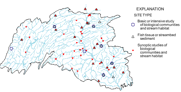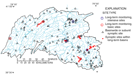 Sites on main stem, major tributaries, and selected smaller tributaries. Sites represented selected subunits and mixed land uses.