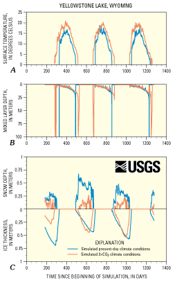 LAKE-SPECIFIC RESPONSES The lake model described above was applied to Yellowstone Lake, Wyoming, and Pyramid Lake, Nevada--two large lakes of contrasting climatic setting (Hostetler and Giorgi, 1994). For both lakes, 3-year meteorological inputs for the lake model were derived by averaging the output for the four RegCM grid points closest to the lake. Actual depth and areal coverage data for each of the lakes were used in the model runs, which are summarized below. Yellowstone Lake lies within Yellowstone National Park in northwest Wyoming and is the largest (surface area 360 km2, maximum depth 98 m), high-altitude (2,537 m) freshwater lake in North America. More than 100 tributaries provide water to the lake, which is drained by the Yellowstone River. The lake is relatively cold, covered by ice during winter, and usually turns over before ice forms and after ice melts. The lake is the native habitat of the Yellowstone cutthroat trout (Oncorhynchus clarki bouvieri), which is important both as a source of food for wildlife and as a game fish. The 3-year average surface temperature for ice-free periods is 11.6oC for the simulated present-day (control) climate and 13.2oC for the 2 X CO2 climate (fig. 5A). The lake changes from being predominantly ice covered (196 days of ice cover) under the simulated present-day climate to being predominantly open (152 days of ice cover) under 2 X CO2 climate conditions. The resulting longer growing season, together with increased water supply to the lake (Hostetler and Giorgi, 1994), would lead to increased productivity of the Yellowstone cutthroat trout under the 2 X CO2 climate.