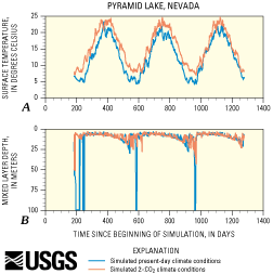 In contrast to Yellowstone Lake, Pyramid Lake is a warm, monomictic (i.e., ice free, with one period of turnover annually), closed-basin (no river outflow) lake located at an altitude of 1,065 m in the high desert that lies within the Paiute Indian Reservation in the lee of the Sierra Nevada. The lake is the native habitat of the Lahontan cutthroat trout (Oncorhynchus clarki henshawi) and the cui-ui sucker (Chasmistes cujus), which are important economic and cultural resources for the Paiute Tribe. The average surface temperature of Pyramid Lake over the 3-year present-day (control) simulation is 12.7oC, compared to 15.5oC under the 2 X CO2 climate simulation. The depth of the mixed layer of Pyramid Lake varies seasonally, with turnover occurring in January. Under modeled present-day (control) conditions, turnover of the lake occurred in January for each of the 3 years of simulation (fig. 6); however, under the 2 X CO2 climate simulation, turnover did not occur in any of the 3 years as a result of warming in the upper 30 m of the lake's waters. The average annual evaporation rate computed for the 2 X CO2 climate (1,595 mm) is 14 percent higher than that calculated for the modeled present-day climate. However, as in the case of Yellowstone Lake, increased precipitation in the 2 X CO2 climate simulation resulted in a net increase in moisture over the lake. The lack of turnover under the 2 X CO2 simulation would result in reduced productivity, which could have large negative effects on the fish populations in the lake.