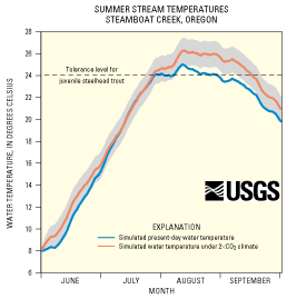 STREAMFLOW Streamflow models are still under development, generally stream-specific, and not yet capable of being applied on a regional scale. In addition, in some areas a substantial portion of river water is derived from ground water, and ground-water flow models are difficult to implement in the Western United States where complex topography and geology determine recharge areas and subsurface flow patterns. Nonetheless, it is still possible to demonstrate the potential sensitivity of specific streams to climate change, such as at Steamboat Creek, Oregon, which lies in a forested watershed on the western slope of the Cascade Mountains. Steamboat Creek and its tributaries provide important spawning and rearing habitats for native steelhead trout (Oncorhynchus mykiss). During part of July and August, present-day average maximum stream temperatures are often near the upper limit of tolerance (24oC) for juvenile steelhead trout (fig. 7).
