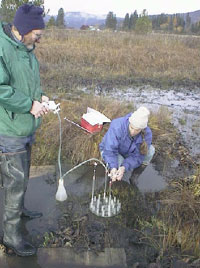 | Research conducted by the U.S. Geological Survey at its Spokane Field Office (in the building pictured above) has evolved to meet the changing needs of our Nation. The Spokane Field Office was established in 1942 to facilitate the Strategic Minerals Program during World War II. Work conducted under this program established the existence of a major zinc-lead ore body at Metaline, Washington, and the presence of tungsten at the Yellow Pine antimony-gold mine at Stibnite, Idaho. Both deposits were mined during the war. | U.S. Geological Survey scientists are tracking the pathways of metals from mine-tailings-impacted flood plains to the Coeur d'Alene River to provide a scientific basis for remediation strategies. The research goals are to understand how these ore deposits formed, how much ore and mining waste is present, and how mining wastes have affected the environment. |