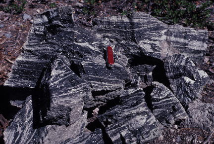 ![]() Banded Pumice Block of banded andesite-dacite pumice erupted on May 22, 1915. This initially large block of hot pumice fell on the eastern slopes of Lassen Peak and broke along a set of polyhedral joints that formed as it cooled in place. The striking color banding reflects mingling of two compositional varieties of erupted magma, contorted by flowage of the incompletely mixed viscous liquids. Photo by R. L. Christiansen, September, 1987. |