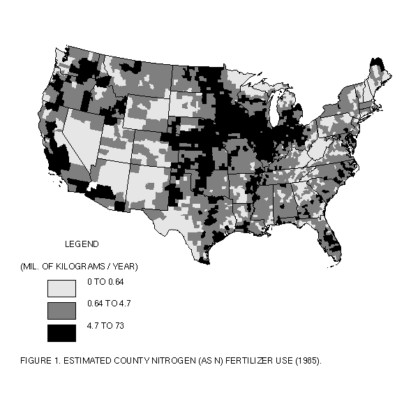 Although state-level fertilizer use data reported by USDA (1966, 1976, 1977-1985) should generally include farm and non-farm uses of fertilizer, this data was disaggregated to U. S. counties in proportion to only reported county farm uses of fertilizer chemicals. Consequently, this disaggregation method underestimates fertilizer use in those counties with large non-farm fertilizer uses.