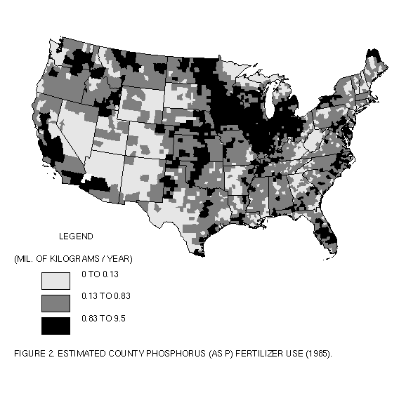 State estimates of nitrogen and phosphorus fertilizer application rates were computed for 1982 as the ratio of state fertilizer use to state fertilized acreage. These application rates are displayed in Figure 6 and 7 and expressed as kilograms per acre. Estimated nitrogen fertilizer application rates ranged from a minimum of 20 kilograms per acre to a maximum of 90 kilograms per acre with a median of 40 kilograms per acre. The highest nitrogen application rates are found in states in the northern midwest, central plains, and far west. Estimated phosphorus fertilizer application rates ranged from a minimum of 4 kilograms per acre to a maxium of 24 kilograms per acre with a median of 9 kilograms per acre. The highest phosphorus fertilizer application rates are found largely in states in New England, the Mid-Atlantic, and the Great Lakes region.