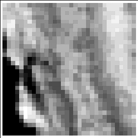 An image of the SanSac region at very low resolution. Although the original satellite data are 1,100 meters and the CD-ROM data are 1 km, this image has been aggregated to 8 km to illustrate how analysis can be conducted at multiple resolutions. This is useful in testing models with smaller data sets and in investigating the role of scale in analysis.
