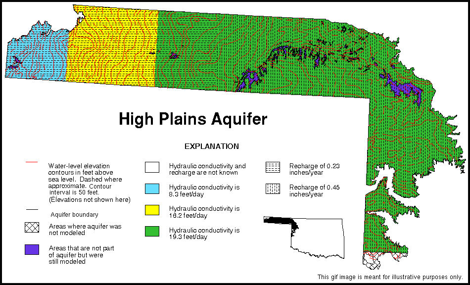 This diskette contains digitized aquifer boundaries and maps of hydraulic conductivity, recharge, and ground-water level elevation contours for the High Plains aquifer in western Oklahoma. This area encompasses the panhandle counties of Cimarron, Texas, and Beaver, and the western counties of Harper, Ellis, Woodward, Dewey, and Roger Mills. The High Plains aquifer underlies approximately 7,000 square miles of Oklahoma and is used extensively for irrigation. The High Plains aquifer is a water-table aquifer and consists predominately of the Tertiary-age Ogallala Formation and overlying Quaternary-age alluvial and terrace deposits. In some areas the aquifer is absent and the underlying Triassic, Jurassic, or Cretaceous-age rocks are exposed at the surface. These rocks are hydraulically connected with the aquifer in some areas (Havens and Christenson, 1984).