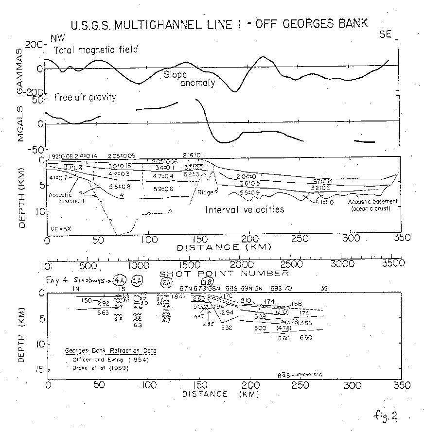 Earlier refraction data is shown at the bottom of Figure 2, which was generally consistent with the interval velocities but left a large gap in the middle shelf. The new clay from FAY 4-1 to 4-4 has only had prelimnary analysis but is penciled in on the refraction settings of the figure. It is clear that the correlation with interval velocities is remarkably good. The high velocity sedimentary rock layer (5.6-5.9 km/sec) was confirmed and probably represents early Cretaceous or Jurassic limestones and dolomites. The 5.0 to 5.4 km/sec material beneath the outher edge of the shelf and upper continental slope probably also represents a carbonate bank or reef which existed at the shelf edge in the early or Middle Cretaceous period.