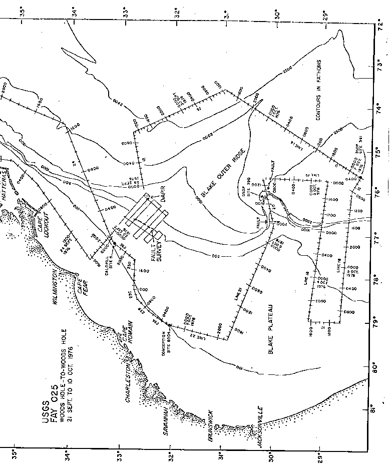 After departing the buoy site the FAY continued south at full speed along CDP line #12 until past Cape Hatteras and just north of Cape Fear. At 1530Z/24 September, the R/V FAY turned southeast, slowed and deployed the airgun, minisparker and magnetometer systems. Line #1 ( Figure 2 and Figure 3) led across the Blake Plateau into the area for the fault survey. That survey continued until 2112Z/ 28 September during which time lines # 1 through 11 were completed. The fault was found to be 40 to 50 km long and trend at about N25dE, A diapir structure was also found at the southeast end of the fault survey ( Figure 2 and Figure 3).